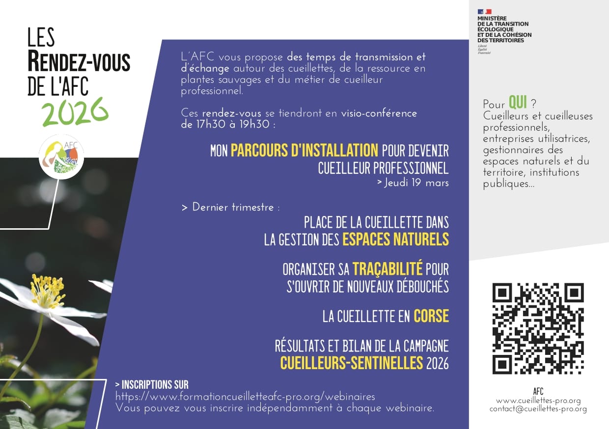 Depuis 2024, l’AFC propose chaque année un cycle de webinaires autour des cueillettes professionnels et des enjeux de préservation des ressources en flore sauvage.