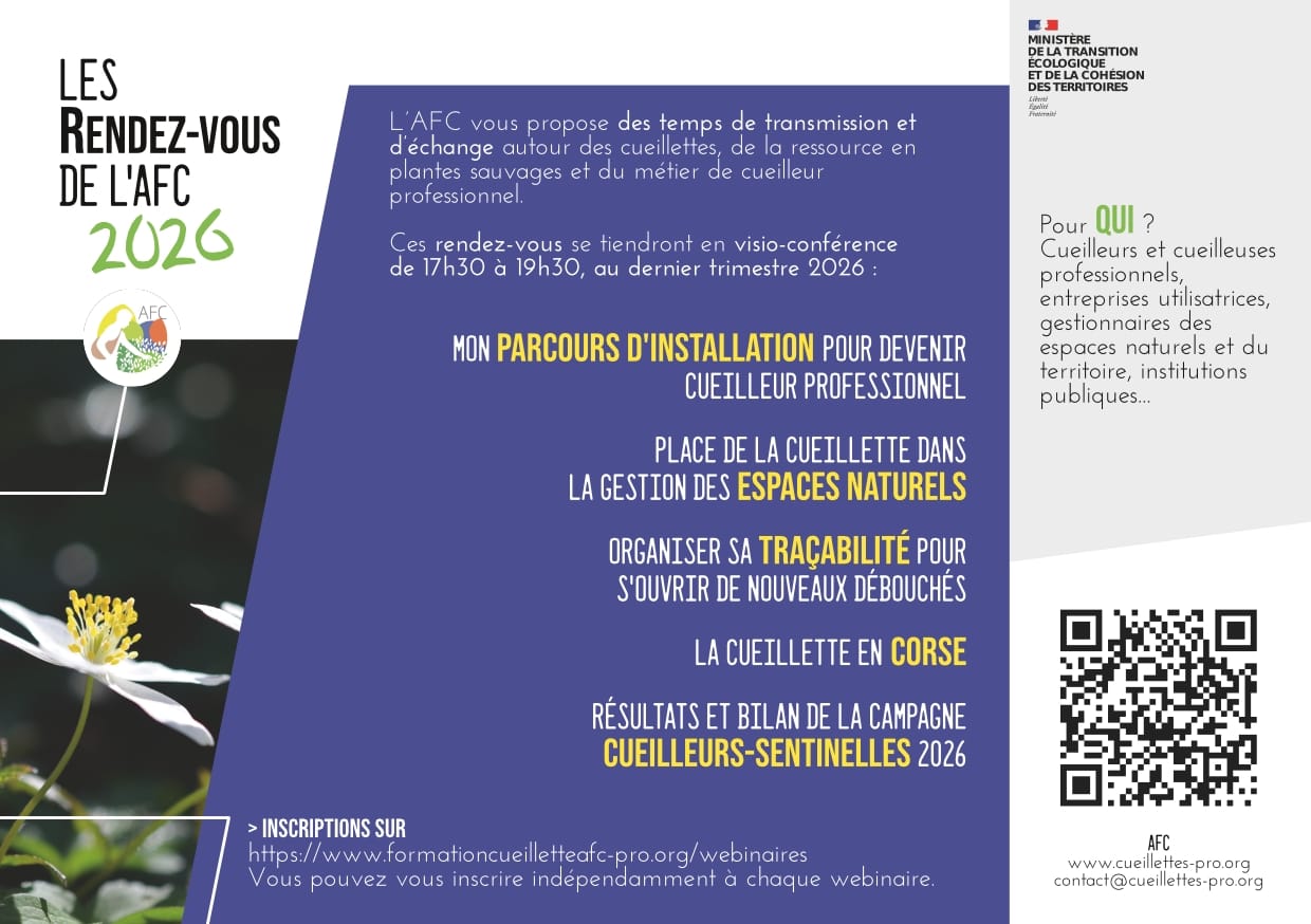 Depuis 2024, l’AFC propose chaque année un cycle de webinaires autour des cueillettes professionnels et des enjeux de préservation des ressources en flore sauvage.